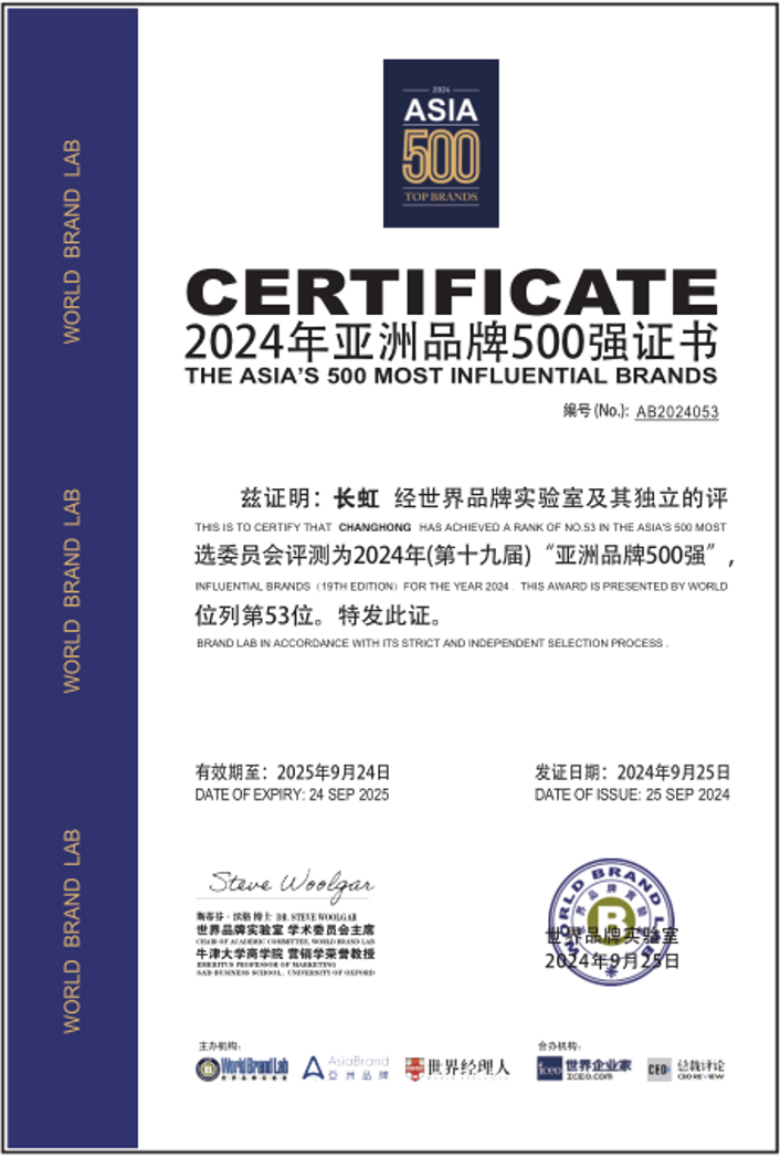 昨日,2024 年“亚洲品牌大会 (asia brand summit)暨亚洲品牌 500 强发布会”隆重举行。经世界品牌实验室(world brand lab)评测甄选,“长虹”品牌入选“2024年(第十九届)亚洲品牌500强”最终榜单,位列第53位,同比去年升2位,创历史新高。